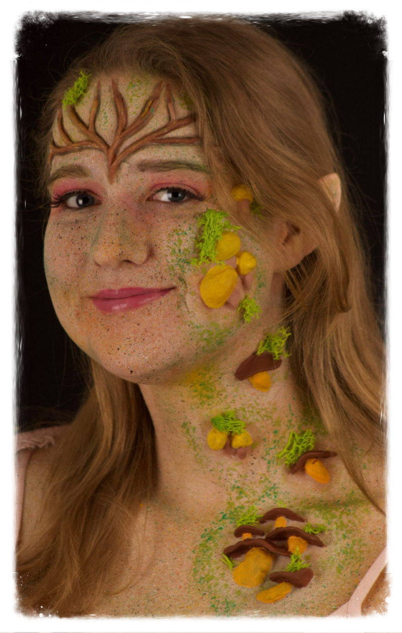 Dit is Aria zij leefde een lange tijd geleden, met een gezicht gehuld in de betovering van het bos. Paddenstoelen bloeiden op een deel van haar gezicht en hals, als kleine sprookjesrijkjes die haar omhelsden. Haar groene haar danste op de wind, terwijl boomwortels haar voorhoofd sierden als levende aderen.